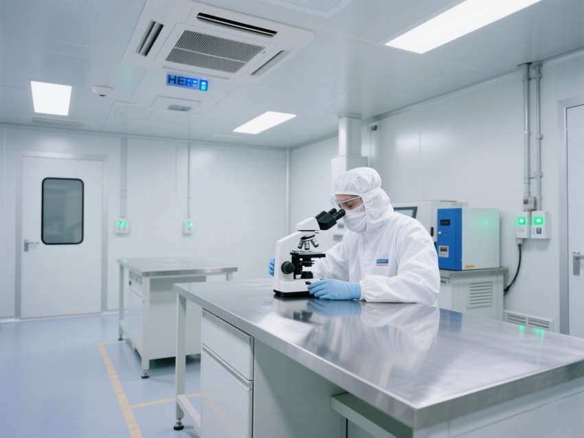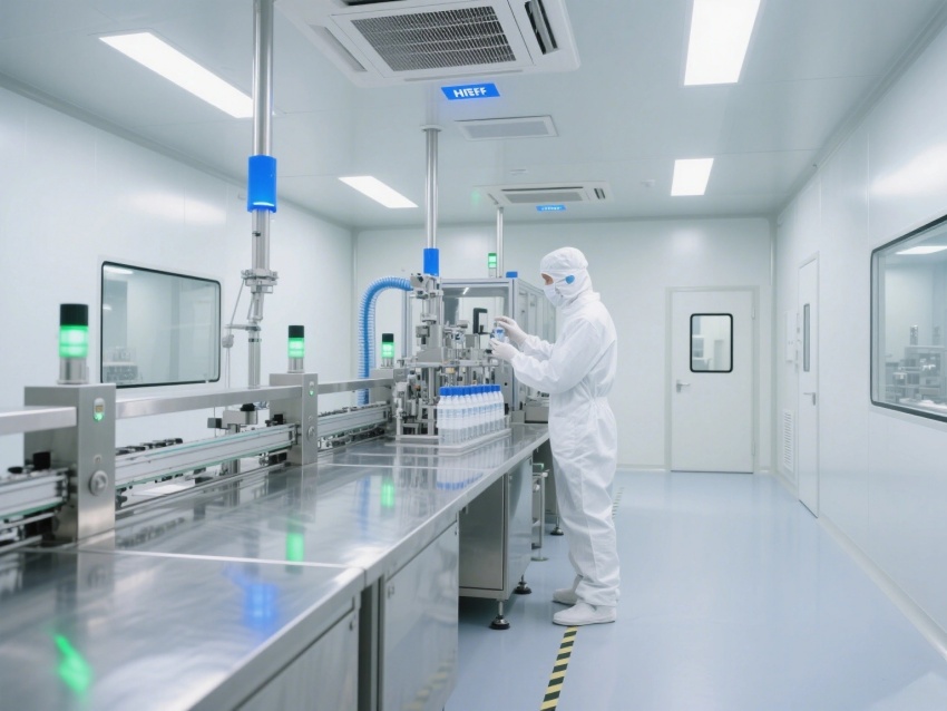 核心區域可見全封閉式潔凈廠房,墻面與地面采用無縫一體化設計,避免積塵殘留。多組高效空氣過濾器整齊排列于頂部,通過層流送風系統維持Class8級潔凈標準。?
