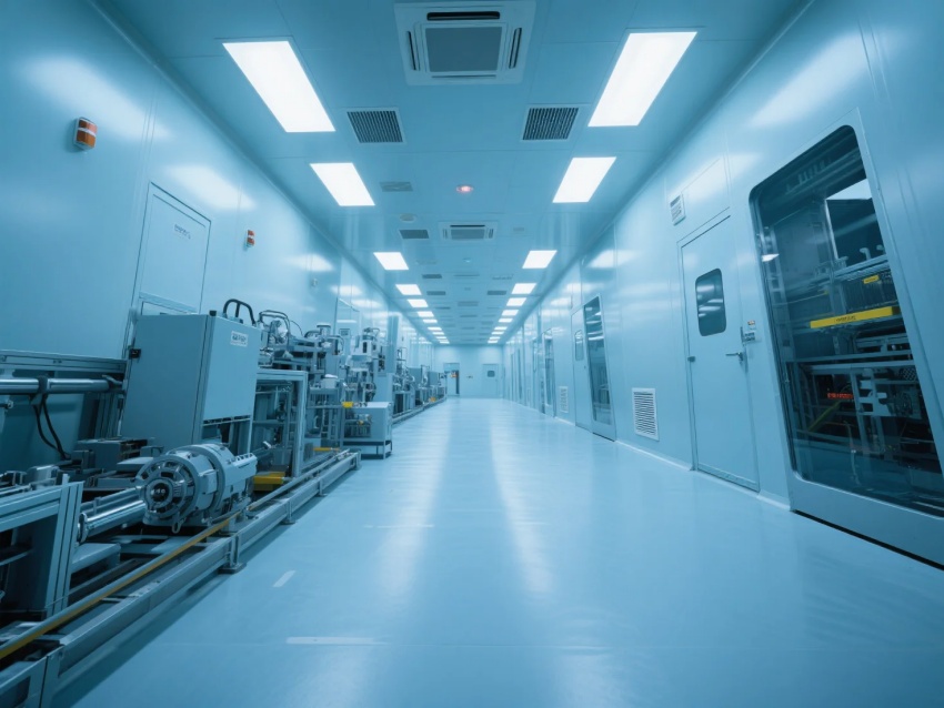 本方案嚴(yán)格遵循ISO6級(千級)潔凈標(biāo)準(zhǔn),采用模塊化潔凈室結(jié)構(gòu),以灰白色調(diào)為主,搭配防靜電高架地板與金屬壁板,打造高精度半導(dǎo)體生產(chǎn)環(huán)境。