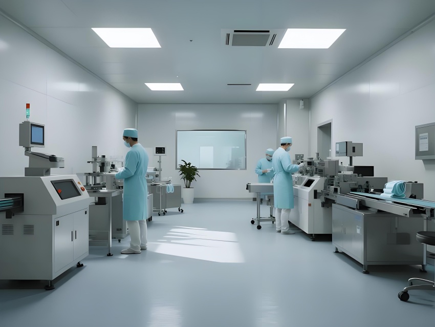 本潔凈車間設(shè)計(jì)采用現(xiàn)代工業(yè)極簡(jiǎn)風(fēng)格,強(qiáng)調(diào)功能性與潔凈度。主色調(diào)選用淺灰藍(lán)(墻面)與純白(頂面)的搭配,營(yíng)造冷靜專業(yè)的氛圍,局部用淡綠色做視覺緩沖。