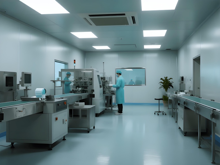 地面采用防靜電環(huán)氧自流平,耐磨無縫隙且易清潔;墻面為50mm厚抗菌彩鋼板,圓弧角處理避免積塵;頂面配置一體化鋁扣板吊頂,內(nèi)置FFU空氣過濾單元,與LED平板燈形成均勻照明。
