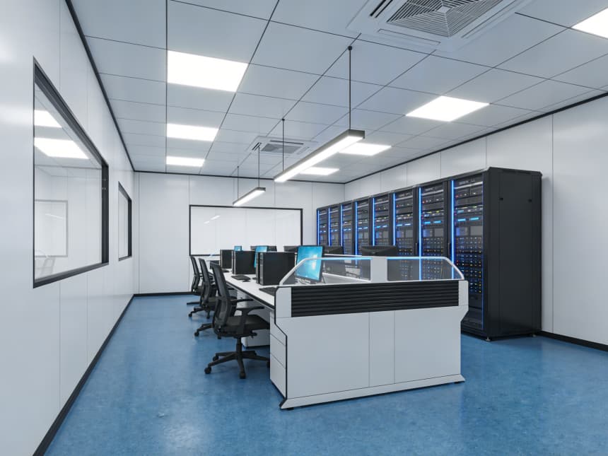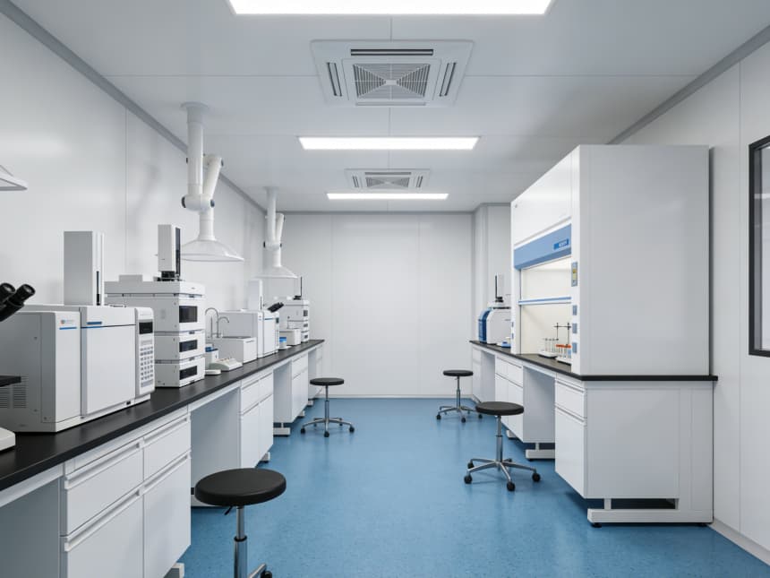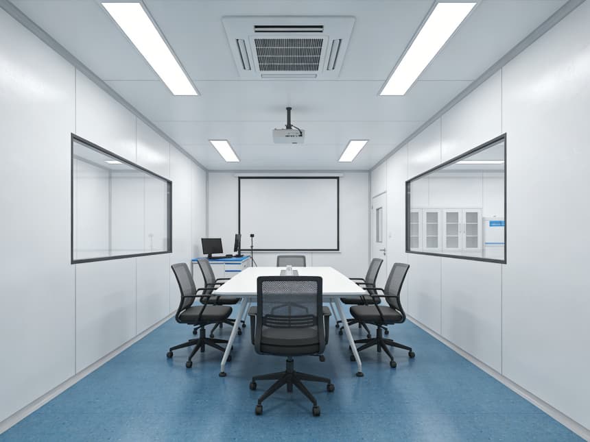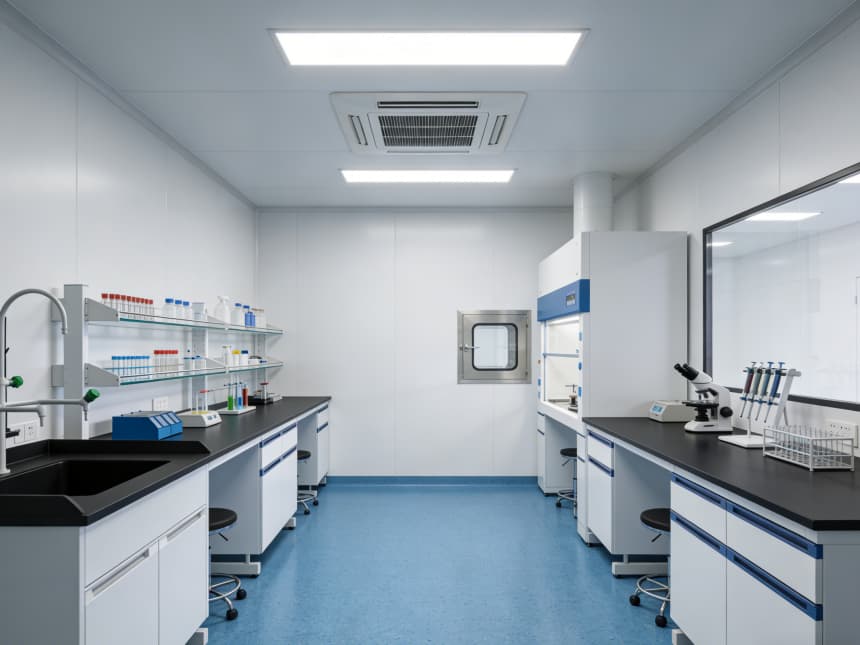 內部研發(fā)空間均以藍色耐磨防靜電地坪搭配白色無縫抗菌墻面,視覺清爽且適配研發(fā)需求。藍色地面選用高耐磨環(huán)氧材質,具備良好的承重性與易清潔性,可耐受實驗試劑殘留擦拭,同時兼具輕微防靜電性能,保護精密研發(fā)設備;白色墻面采用環(huán)保抗菌涂層,平整度高且減少光線反射,搭配嵌入式護眼照明,營造舒適的研發(fā)視覺環(huán)境。