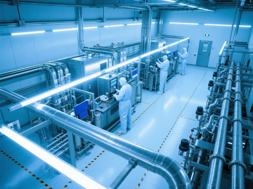 本百級車間采用"超凈工業未來主義"風格,符合ISO14644-1Class3標準(≥0.1μm顆粒≤1,000/m³)。設計核心突破: