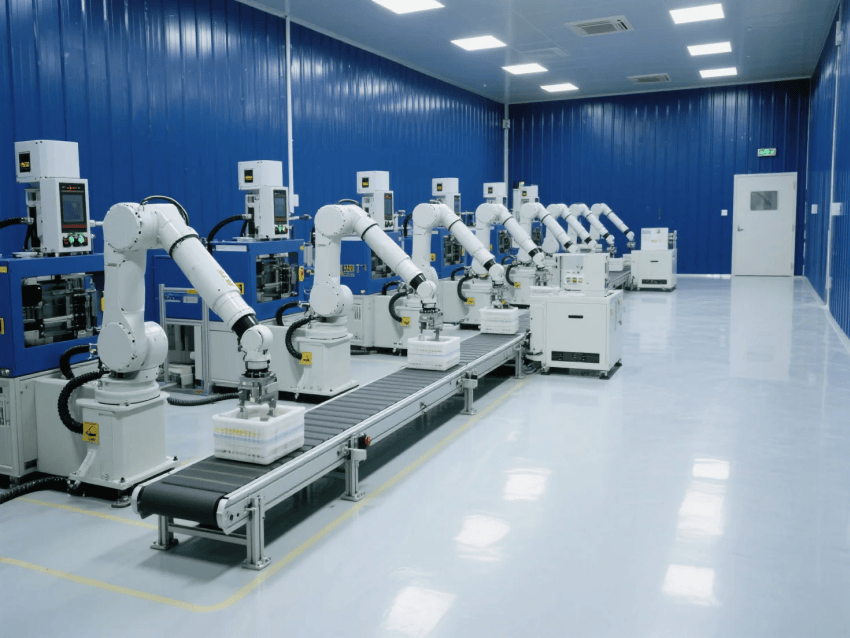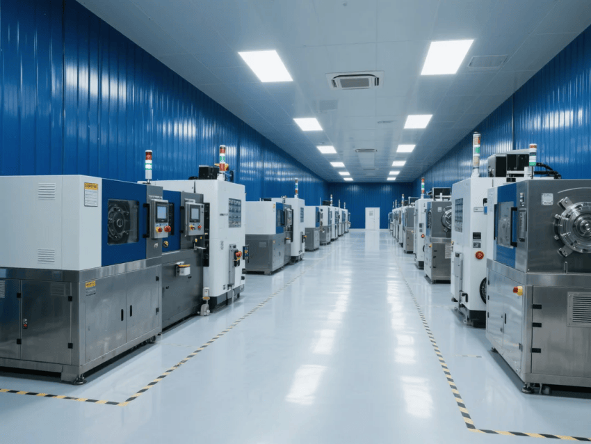 智能控制系統(tǒng)集成環(huán)境監(jiān)測、設(shè)備聯(lián)動(dòng)與生產(chǎn)看板,深藍(lán)墻面上嵌裝LED數(shù)據(jù)顯示屏,實(shí)時(shí)反饋工藝參數(shù)。照明系統(tǒng)采用600x600mm潔凈平板燈,色溫5000K,重點(diǎn)工位增設(shè)局部補(bǔ)光。整體設(shè)計(jì)通過冷色調(diào)的工業(yè)美學(xué)與自動(dòng)化產(chǎn)線融合,構(gòu)建高效、精準(zhǔn)的現(xiàn)代化注塑生產(chǎn)空間。
