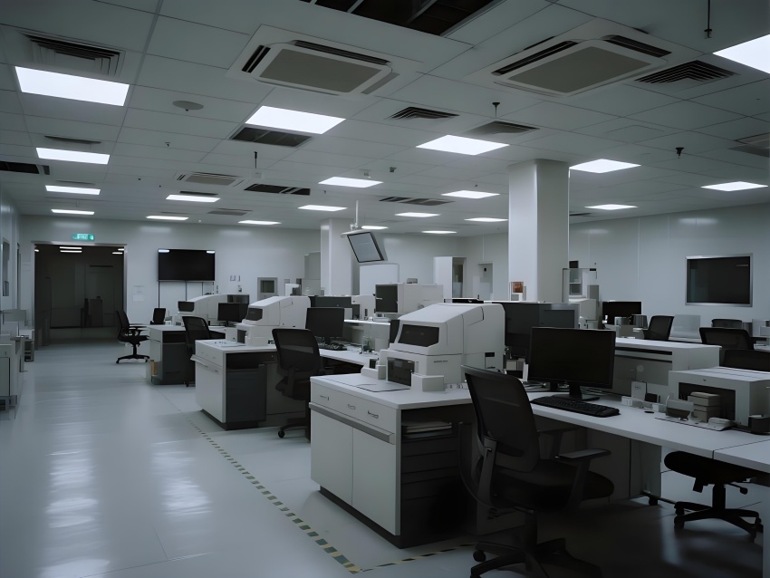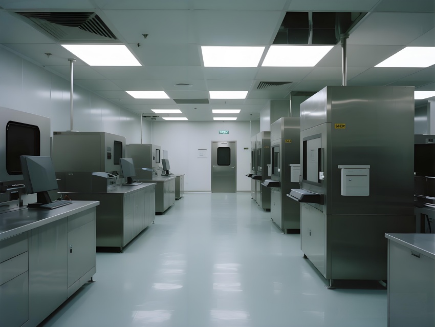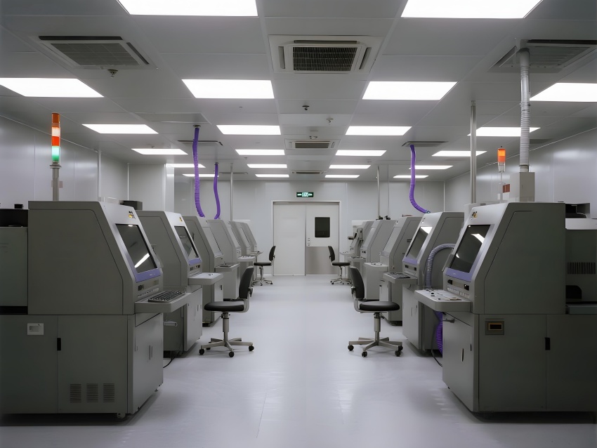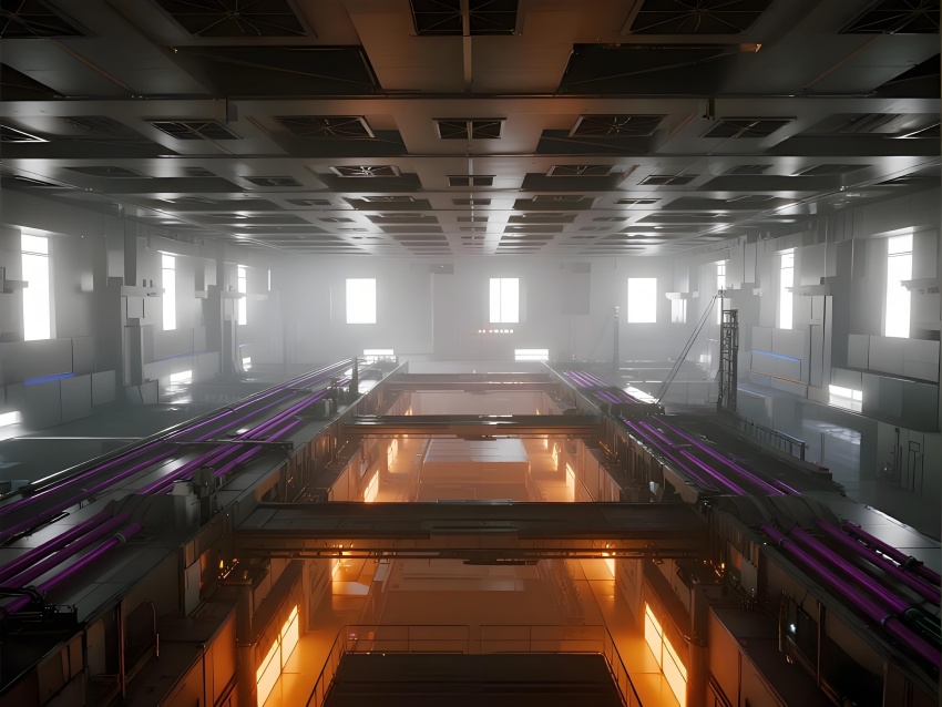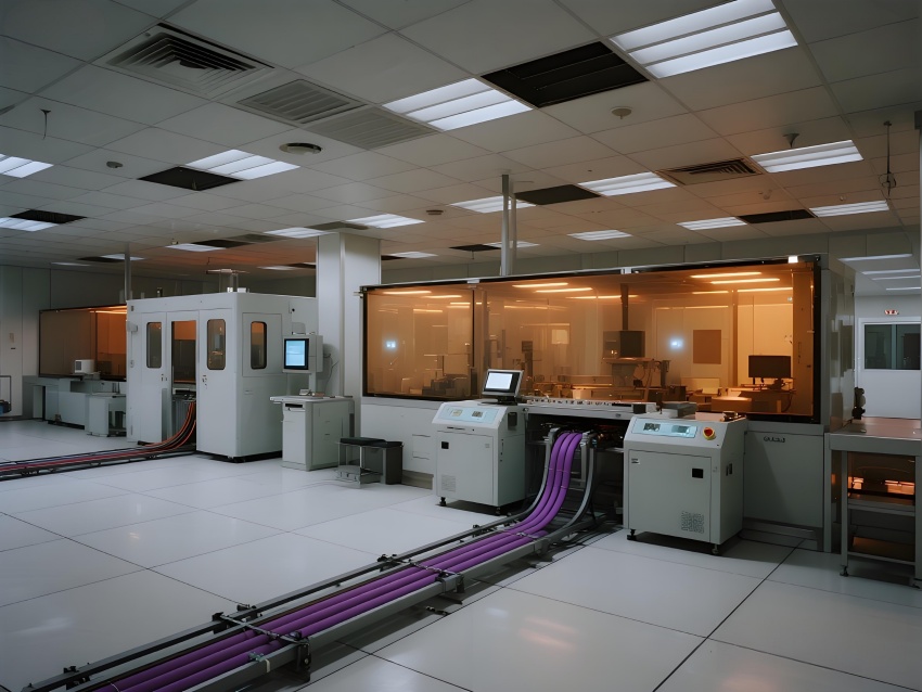 本芯片廠采用"硅基未來主義"設(shè)計(jì)風(fēng)格,將納米級(jí)制造的精密感轉(zhuǎn)化為宏大的工業(yè)美學(xué)。空間以鈦銀與深空灰為主色調(diào),光刻區(qū)的琥珀色防霧照明與蝕刻區(qū)的冷紫工藝氣體管道形成科技光譜。高架地板下的藍(lán)色氣流指示燈模擬集成電路紋路,天花板的矩陣式FFU單元如晶圓陣列般規(guī)整。透明設(shè)備艙內(nèi)機(jī)械臂的精準(zhǔn)運(yùn)動(dòng)軌跡,與墻面懸浮的晶圓生產(chǎn)數(shù)據(jù)流構(gòu)成動(dòng)態(tài)敘事。防靜電涂層的金屬質(zhì)感表面反射出潔凈室的無限縱深感,關(guān)鍵區(qū)的紅色激光定位光幕則強(qiáng)化半導(dǎo)體制造的危險(xiǎn)與精確。通過嚴(yán)格的功能色彩編碼(黃-光刻/紫-蝕刻/藍(lán)-檢測)和極簡的無縫設(shè)計(jì),在滿足ISO14644Class1標(biāo)準(zhǔn)的同時(shí),塑造出如同微觀芯片放大至建筑尺度的震撼視覺隱喻。