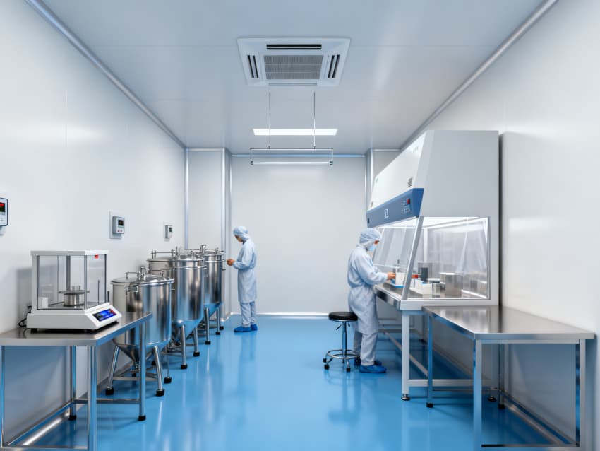 核心生產車間參數差異化設計:原料處理車間為10萬級潔凈區,配備初、中、高效三級過濾系統,高效過濾器效率≥99.99%,送風量2000m³/h;試劑配制車間達萬級潔凈標準,采用頂送風、側回風模式,單向流風速0.3-0.5m/s,溫濕度控制精度±2℃、±5%RH;無菌分裝車間為百級潔凈區,配置層流罩,潔凈度≥0.5μm塵粒≤350個/m³,微生物≤1個/皿。