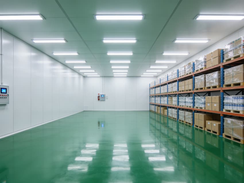 整體空間采用醫藥級潔凈圍護體系:墻面與頂板選用抗菌型潔凈彩鋼板,搭配圓弧角收邊與密封膠條,徹底消除積塵死角;地面為綠色防靜電環氧自流平材質,表面光滑耐磨、易清潔消毒,同時具備靜電消散功能,避免靜電對藥品的潛在影響。吊頂集成 FFU 風機過濾單元與恒溫恒濕控制系統,可穩定維持十萬級潔凈度與 18-26℃的工藝環境,通過壓差管控保障各區域空氣單向流動,有效防止交叉污染。