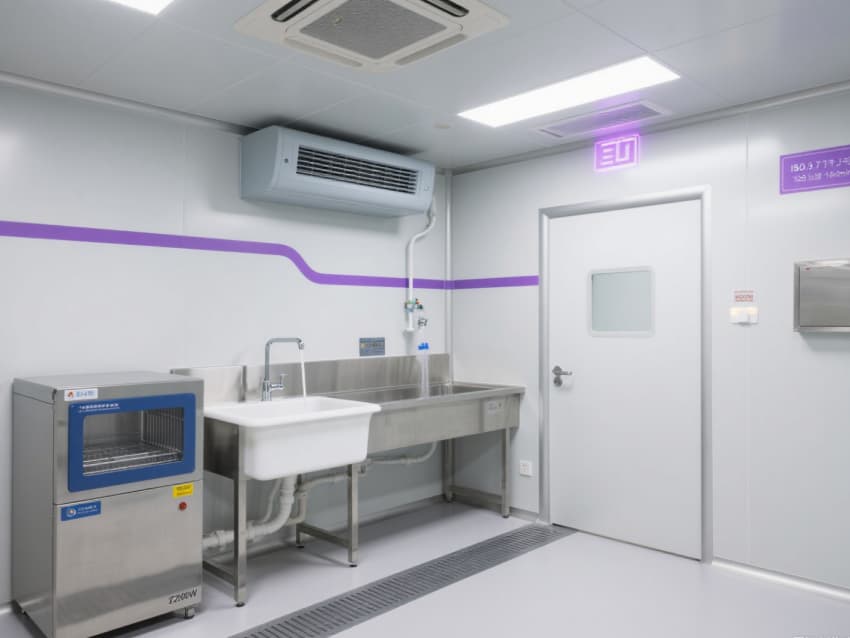 空間配備嵌入式LED潔凈燈(照度≥400lux)、恒溫恒濕控制系統(tǒng)(溫度22±1℃,濕度50±3%),不銹鋼潔凈門窗采用高氣密性密封結構。實驗區(qū)預留高精度儀器接口與防靜電接地端子,紫色氣流流線標識引導操作動線,全方位保障精密實驗的準確性與穩(wěn)定性。