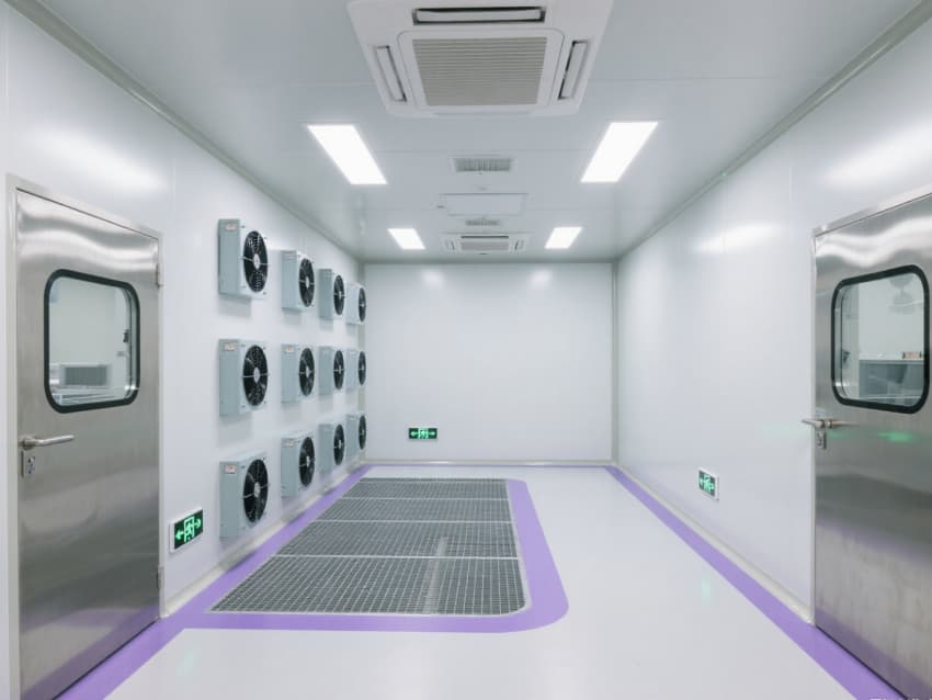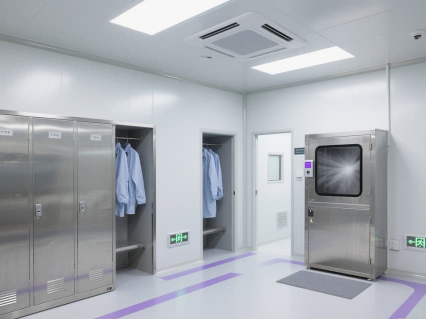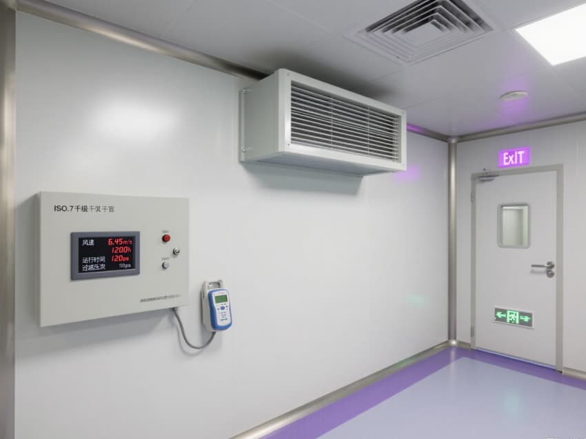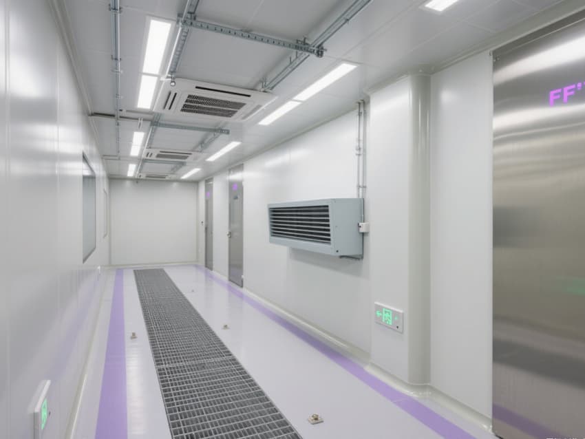 實驗室以銀白色抗菌金屬彩鋼板構建墻體與吊頂,搭配淺灰色防靜電環(huán)氧地坪,金屬質感與冷色調結合,既強化潔凈氛圍,又具備抗腐蝕、易消毒特性。墻面與地面的圓弧過渡設計消除積塵死角,頂部密布的FFU風機過濾單元形成垂直層流,配合側下回風系統(tǒng),實現(xiàn)每小時25-30次空氣置換,持續(xù)維持室內正壓。?