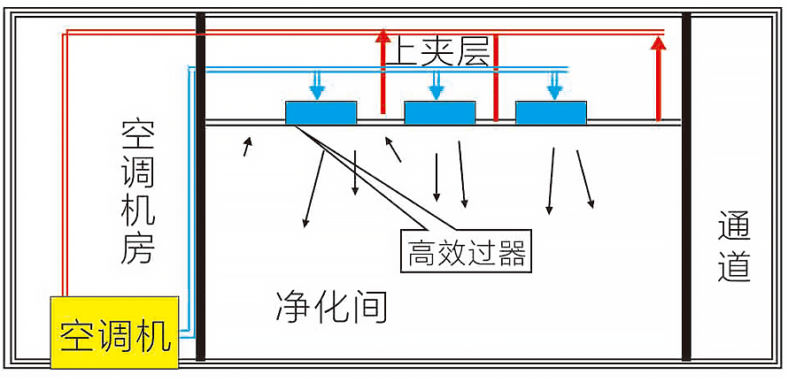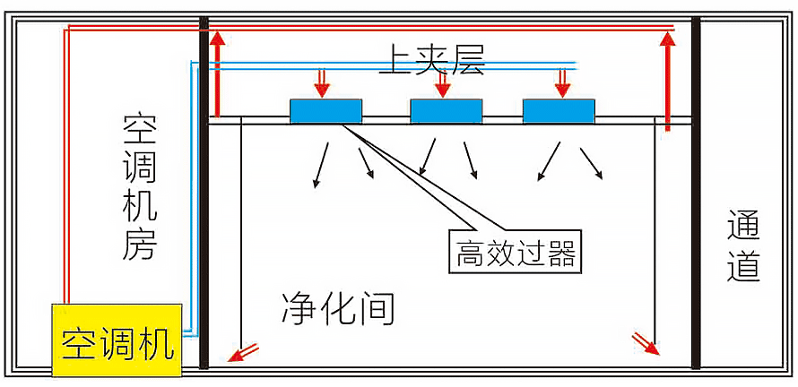2、單夾層、集中送風、上夾層為靜壓箱.