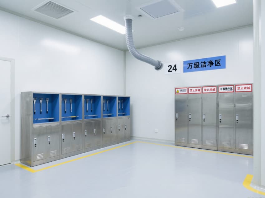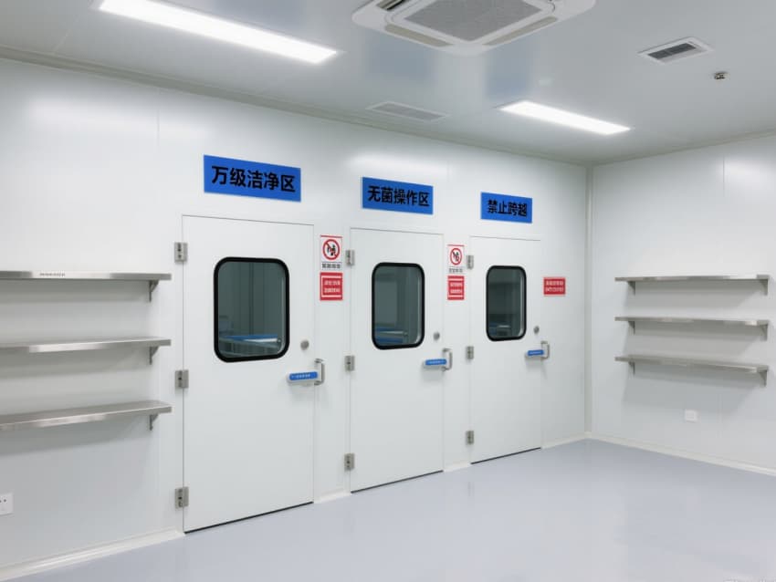 空間內(nèi)配備不銹鋼潔凈門窗與雙扉傳遞窗,均采用高氣密性密封結(jié)構(gòu);嵌入式LED潔凈燈提供300-500lux均勻照明,無眩光設(shè)計(jì)保障操作精度。恒溫恒濕系統(tǒng)精準(zhǔn)控制溫度(20-24℃)、濕度(45-60%),藍(lán)色功能標(biāo)識(shí)線清晰劃分操作動(dòng)線,全方位營造安全、穩(wěn)定的萬級(jí)無菌環(huán)境。