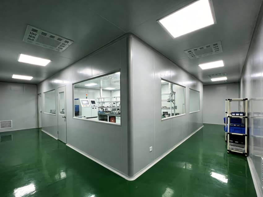 整體空間采用彩鋼板模塊化圍護系統,墻面與頂板選用抗菌潔凈彩鋼板,搭配圓弧角收邊處理,徹底消除積塵死角;地面為綠色環氧自流平材質,兼具防靜電、耐磨、易清潔特性,滿足光器件生產對微塵管控的嚴苛要求。吊頂集成 FFU 風機過濾單元與回風系統,可穩定維持萬級潔凈度,為光芯片耦合、貼片封裝等核心工序筑牢環境基礎。