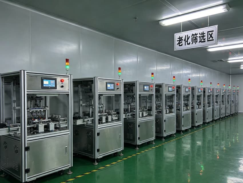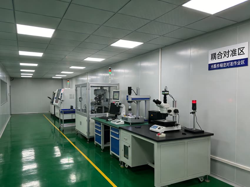 • 核心生產區以黃色警示線明確人車動線,SMT 貼片工位配備防靜電工作臺與遮光防塵罩,保障貼裝精度;“耦合對準區” 采用防震型實驗臺與光學級照明,搭配密閉玻璃隔斷,為光器件微米級對準作業提供穩定、潔凈的操作環境。