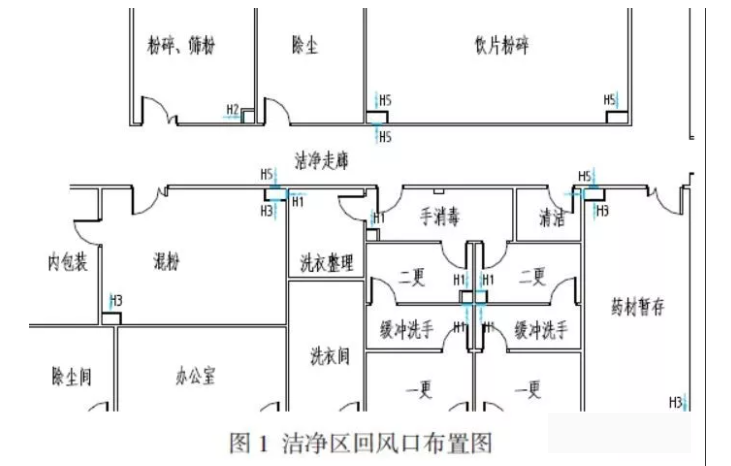 有的潔凈室空調設計,一個潔凈區,面積很大,布置了4 個高效送風口,但回風只有一個,布置在一個墻角。這樣做,使得全室空氣流向一處,必然存在死角,潔凈空氣難以到達,使該區域塵埃粒子增多,影響潔凈度。而回風速度大,會在回風口附近甚至工作面高度形成較強渦流,使得塵粒擴散,同樣影響潔凈室空氣質量,影響潔凈度。所以,非單向流潔凈室回風口要根據風量布置,風速不能過大,以不大于2m/s 為宜。回風口要布置于兩面(或多面)墻上,為了不增加衛生死角,一般對角布置。潔凈室寬度不大于3m 時,可以單側布置。